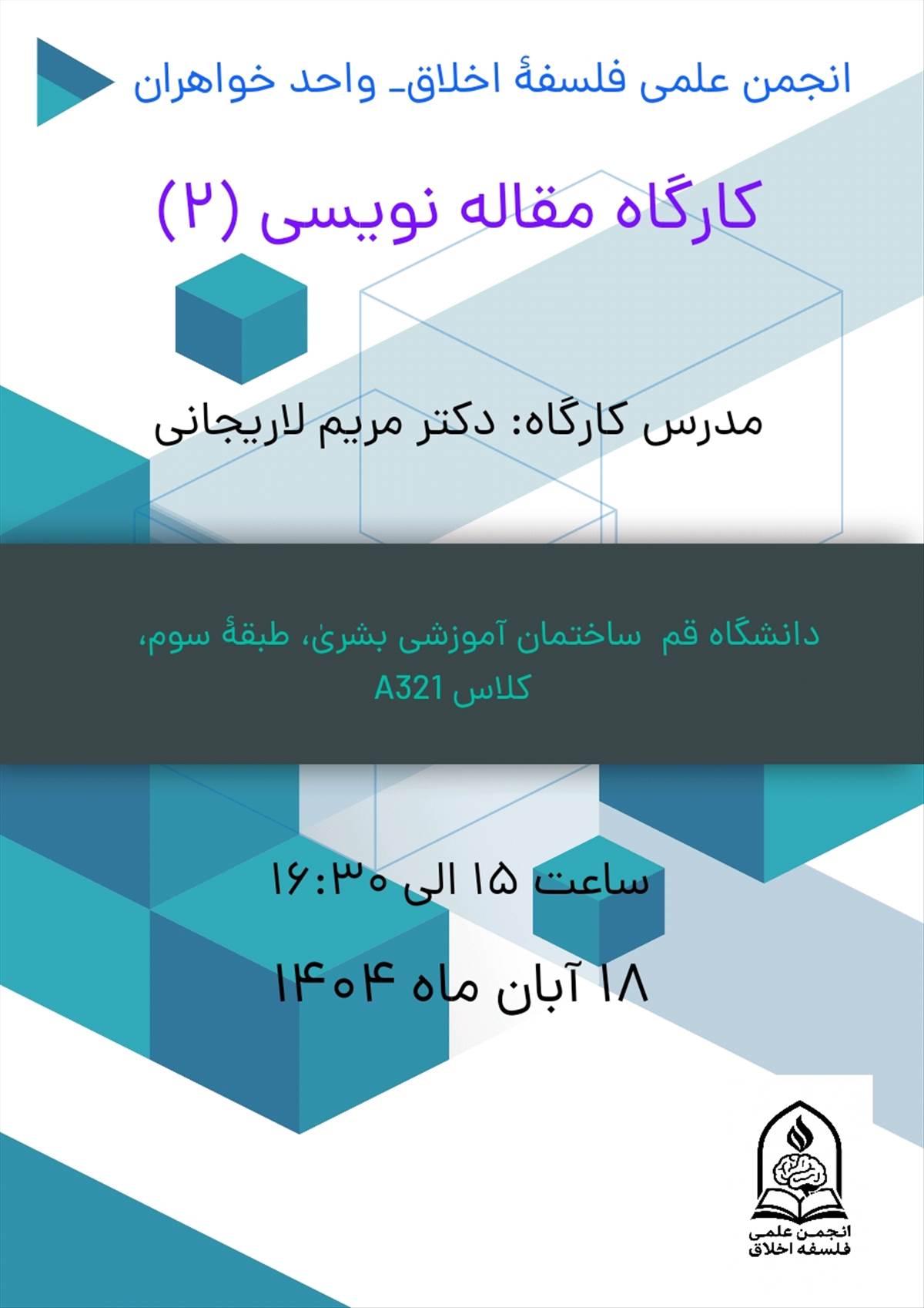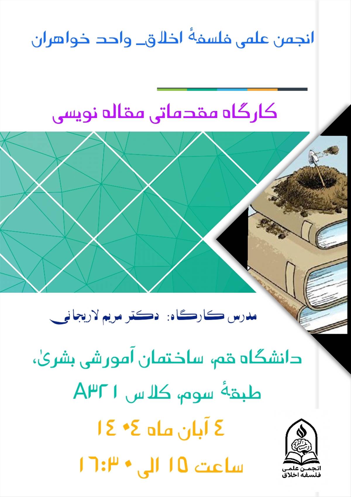 پوستر کارگاه مقدماتی مقاله نویسی توسط اعضای انجمن فلسفه اخلاق واحد خواهران با خانم دکتر مریم اردشیرلاریجانی