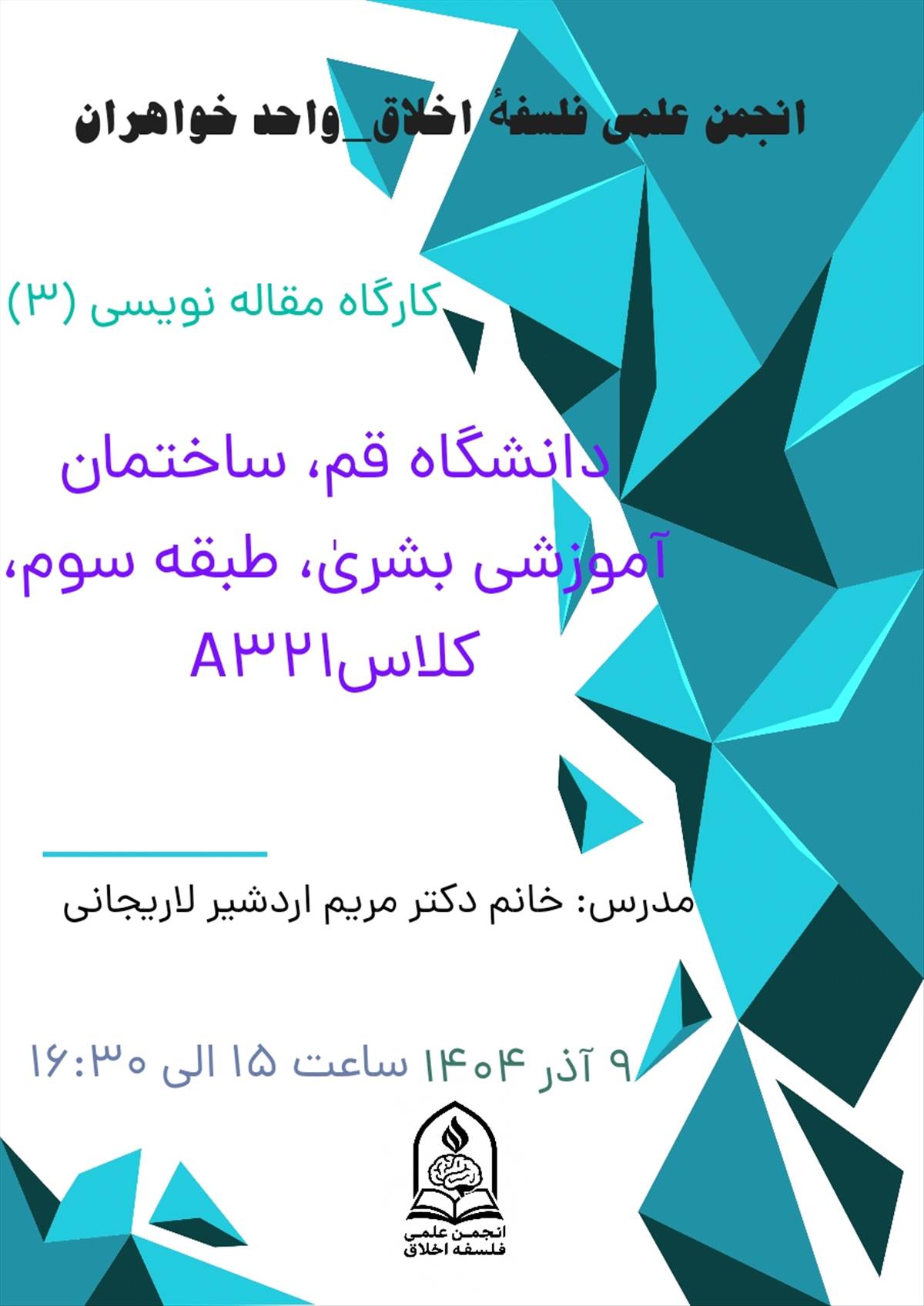 پوستر کارگاه مقاله نویسی 3، برگزار شده توسط اعضای انجمن فلسفه اخلاق واحد خواهران و ارائه و تدریس خانم دکتر مریم اردشیرلاریجانی