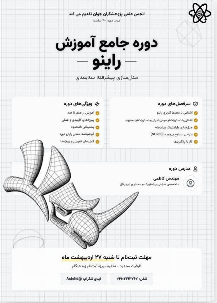 مدرس این دوره، خانم مهندس کاظمی، از اساتید دانشگاه و متخصصان برجسته در زمینه طراحی سهبعدی، هدایت جلسات آموزشی را برعهده داشت. سرفصلهای دوره شامل آشنایی با محیط کاری راینو، تنظیمات و ابزارهای کاربردی، دستورات ترسیمی و ویرایشی، دستورات ترنسفورم، پلاگینها، مدلسازی انواع آبجکت، طراحی داخلی، و مدلسازی پارامتریک و ارگانیک به صورت پروژهمحور بود.